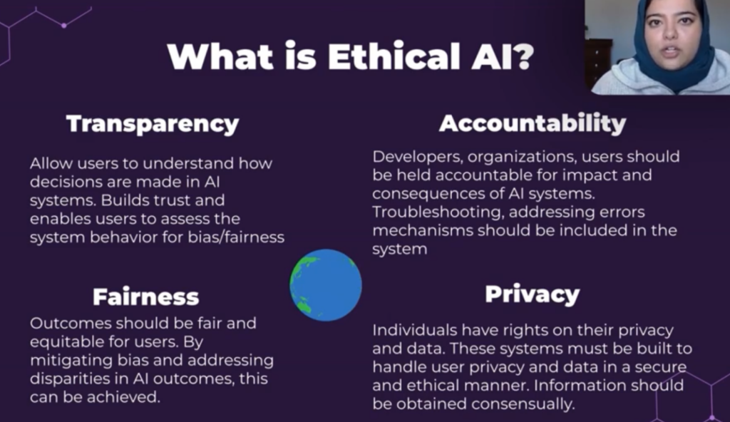 She breaks down the fact that AI is dynamic. As it is changing its ethical frameworks must follow to remain as accurate and at pace with the constantly developing technologies connected to it. This means developing and monitoring outputs to be as fair and equitable as possible. I have had conversations with peers on AI systems not having accurate or advanced information and alphabet representation for example to represent local Indigenous communities. This could pose another challenge to its abilities to take over a classroom, as much of this knowledge isn’t readily available online and rooted in deep human-based experience, intricate pedagogical approaches, emotion and intergenerational stories that for many reasons are not publicly online.