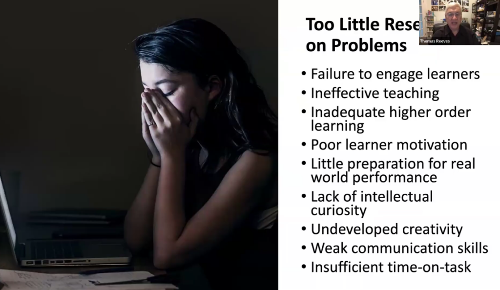 Watching Dr. Thomas Reeves Keynote made me think about how the challenges he spoke of related to my own educational experiences. He talked about the grand challenges in online learning linking to under researched problems like teacher burnout, student motivation, engagement, and equity.
