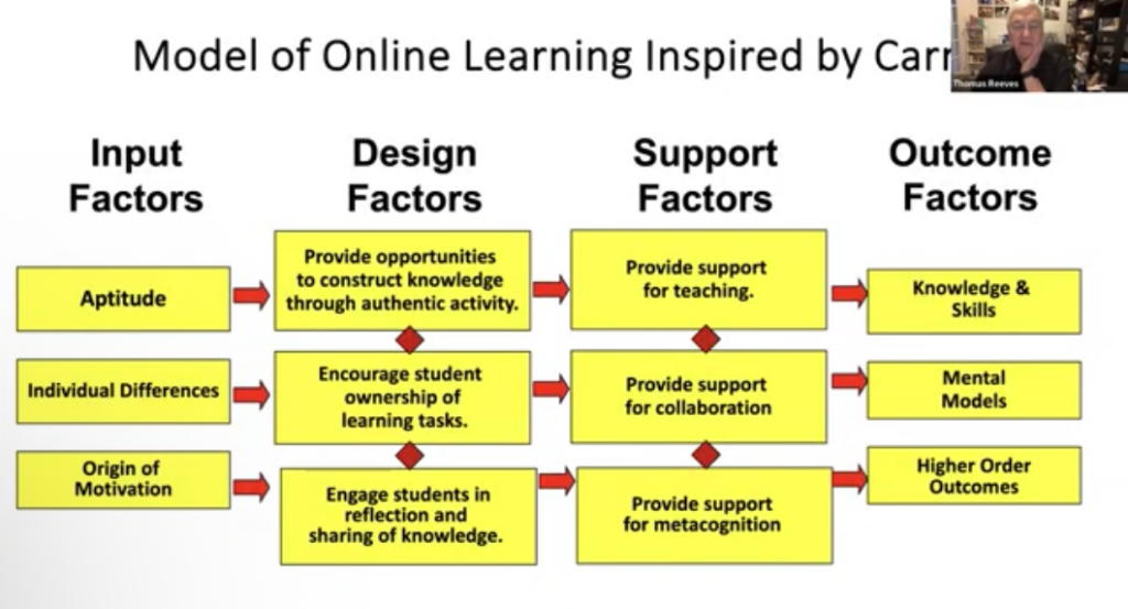 To better online learning and recognize practices against these negative scenarios Reeves states the need to conduct the research itself around educational designs which influence practice and aim to aid “learners who lack self discipline and motivations.”(Dr. Reeves Keynote) He also notes the need to “worry of long-term impacts using AI like students relying on these programs, missing real relational contexts or lacking motivations due to this.”(Dr. Reeves Keynote) I believe that in order to work towards these purposeful guiding, acknowledgements, and integration needs to be done as an educator helping design an effective approach or model to using technology as a class. Here is Reeves’ updated model idea for online learning as a helpful guide.