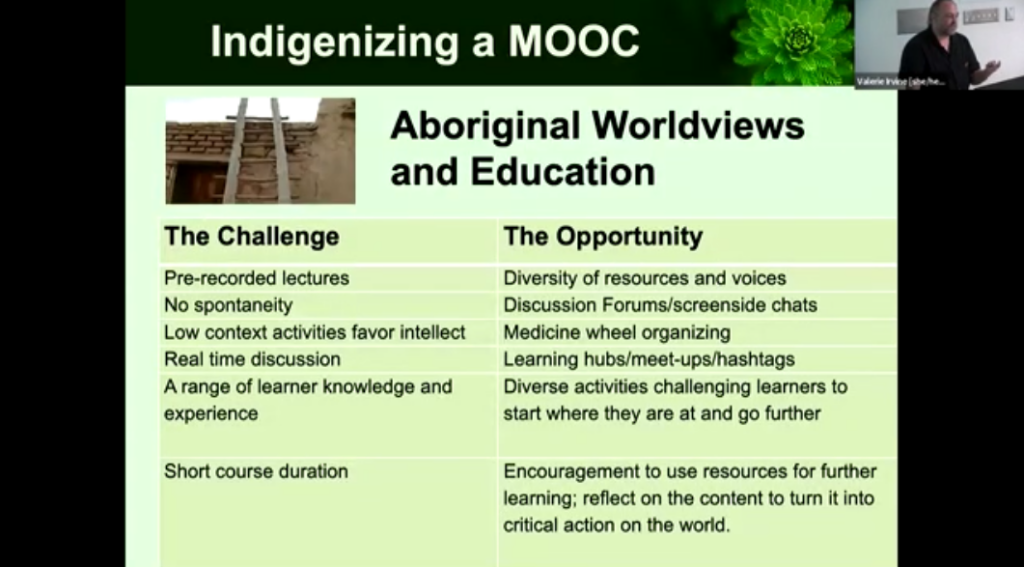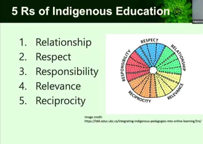 Dr. Jean-Paul Restoule’s insightful zoom breakdown on Indigenous-centred online course design expanded my idea of ways Indigenous ways of knowing and perspectives can be meaningfully integrated in an online/digital focused way as many of my studies connect more centrally to in class designs. He elaborates on the ideas of making an online based class truly community oriented, relational, relevant and focused on forming relationships with the local peoples. This could look like a group circle being more of a discussion forum but sharing the similar routines or integrations as an in person circle. For example In one of my face-to-face Indigenous classes at the moment we practice oral protocols which creates a comforting safe