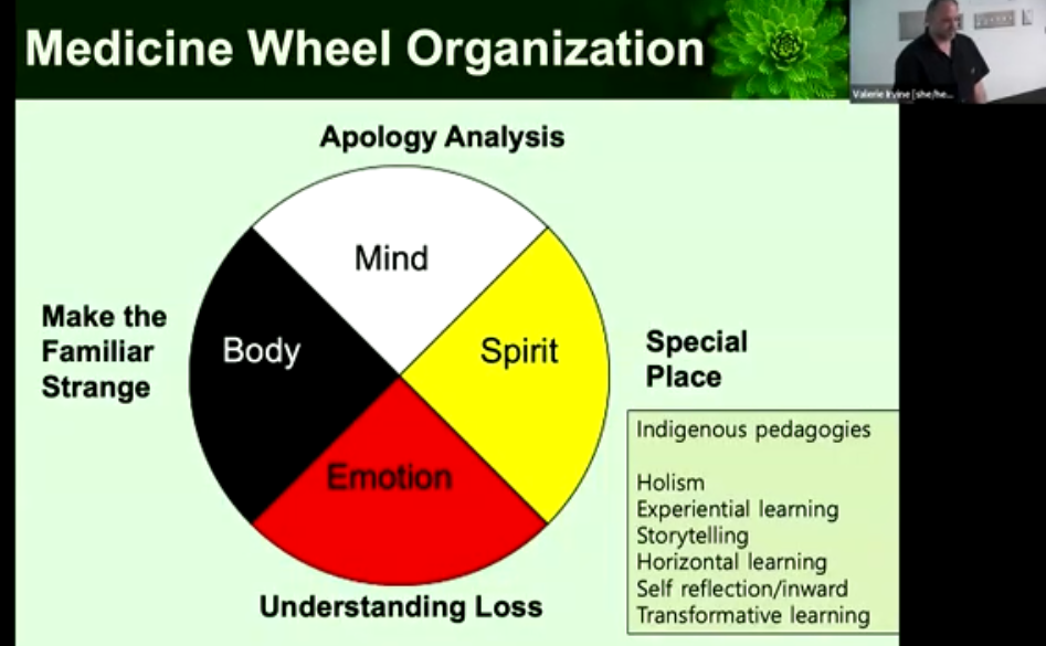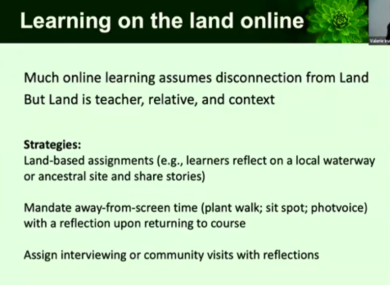 He also points out self-locations’ role in this process as a strong guide to how we as educators acknowledge and hold the responsibility to create a safe space with student opportunity and inquiry but also how we show up in a space to understand the depth in how, why and what is being taught in relation to colonialism and intergenerational impacts. Acknowledging our role, privilege and history on this land is poignant in creating a land based, inclusive and equitable learning environment even through an online space.